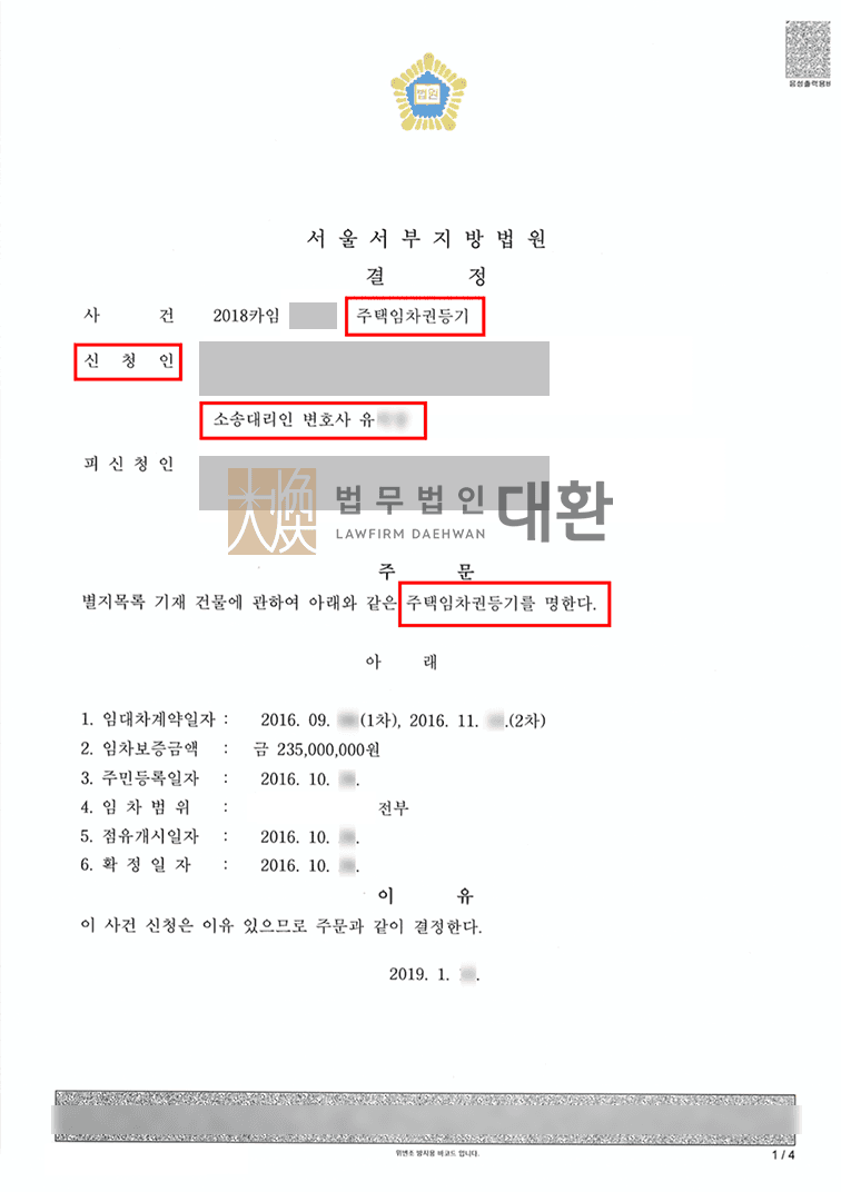의뢰인은 임차인으로서 임대차계약 기간이 만료되었음에도 임대인이 보증금을 반환하지 않아, 법원에 임차권등기명령을 신청하여 인용된 사안입니다.