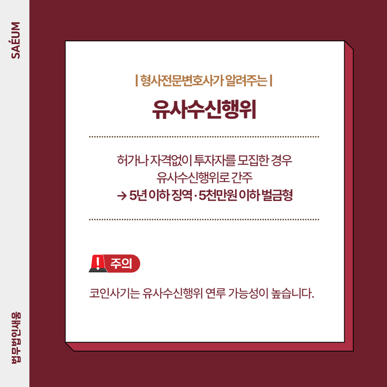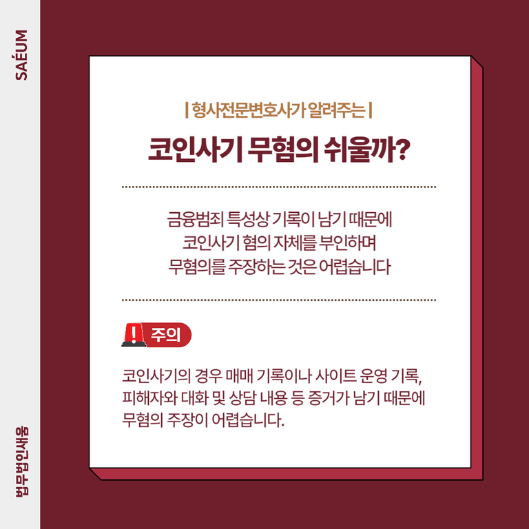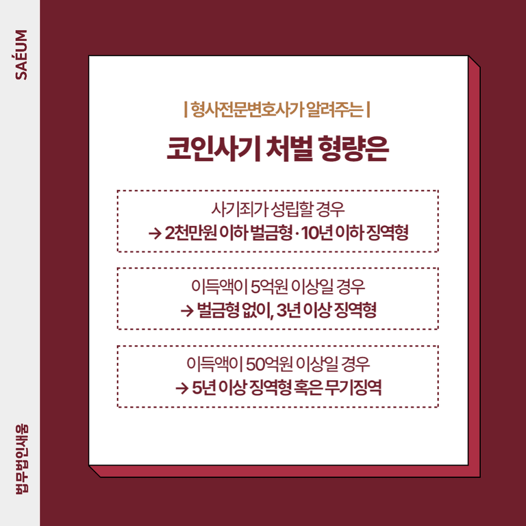 요즘은 코인 사기가 큰 문제가 되고 있어서 혹시라도 무거운 처벌을 받게 되는 것은 아닌지 우려가 되는 상황이었는데요. A씨는 비트코인 사기로 인한 큰 피해를 막기 위해서 법무법인 새움을 찾아오셨고, 이에 저희는 가능한 가벼운 처분이 내려오도록 도움을 드렸습니다.