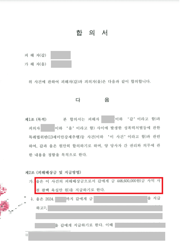 이에 저는 가해자와 장시간 면담을 하며 재산 상태를 파악했고, 가해자로부터 4억 5000만 원 이상으로 피해배상을 받기로 하고 의뢰인께서 원하는 모든 조건을 담아 합의를 진행하였습니다(합의금 외에도 정신과 치료비 등을 별도로 약속하였습니다).