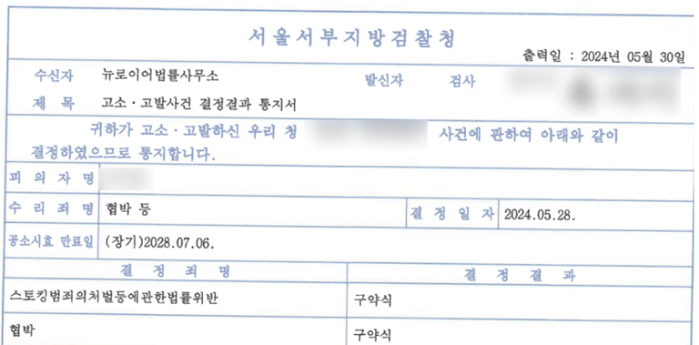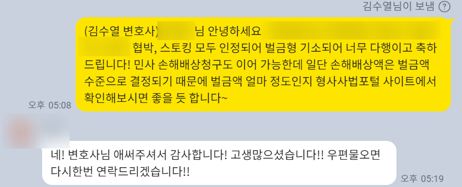 3. 최종 결과 - 임대인 스토킹, 협박 고소 성공사례