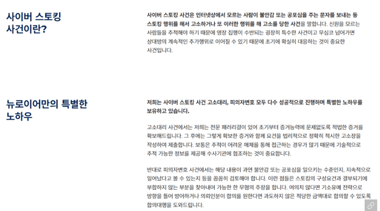 도저히 참다 못한 의뢰인분은 대화로 해결이 되지 않자 스토킹 등으로 정식으로 법적 차원에서 고소를 결심하게 되었고, 스토킹 전문인 뉴로이어를 찾아오셨습니다.