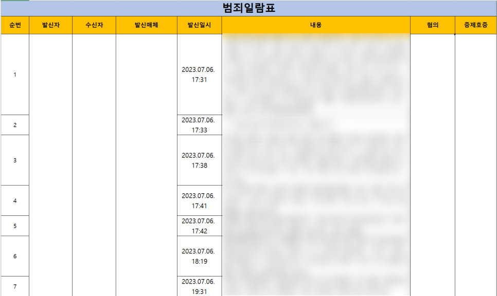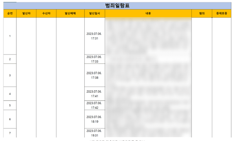 스토킹 사건에서 중요한 것은 이미 여러차례 설명드렸듯이 상대방의 스토킹 행위를 일시와 매체, 내용 등으로 일목요연하게 표로 정리하여 수사관이 범죄사실을 파악할 수 있도록 하는 것인데요. 이를 전문적인 용어로는 '범죄일람표'라고 합니다.