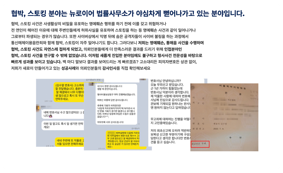 저희는 형사 전문 변호사님을 필두로 스토킹 고소 대리 & 고소 방어를 모두 진행하고 있는데요.