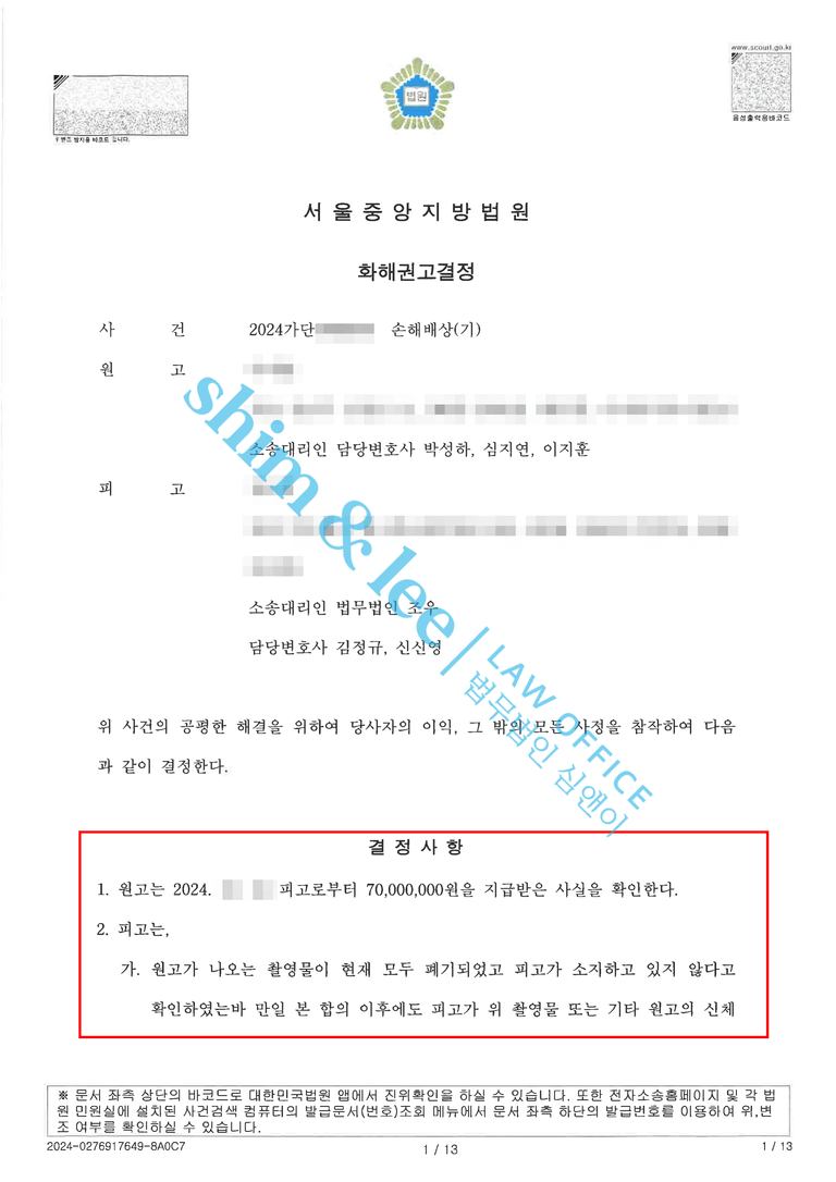 - 또한 시간이 지난 사건으로 큰 기대를 하지 않았던 의뢰인님은 민사에서 예상보다 높은 7,000만 원이라는 강제조정 결정 금액에 대해 크게 기뻐하셨고 가해자측은 합의하고 싶다는 의사를 비추며 합의 요청을 하게 됩니다.