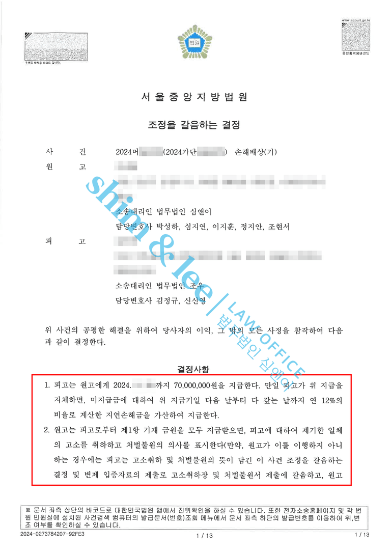 - 오랜시간 고통 받으셨던 의뢰인님을 위해 심앤이는 조정결정문에는 적혀있지 않은 세세한 항목까지 합의서에 모두 넣어 의뢰인님께서 만족해 하시는 내용과 금액으로 합의까지 잘 마무리하게 되었습니다.