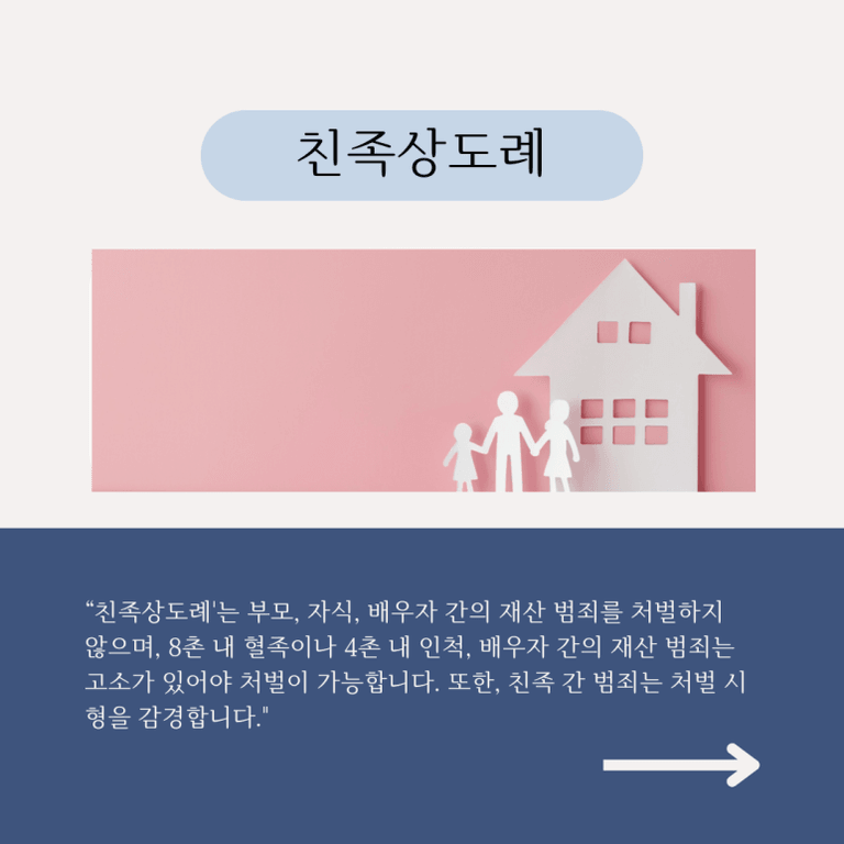 '친족상도례'는 부모, 자식, 배우자 간에 발생한 재산 범죄를 처벌하지 않는다는 규정입니다. 또한, 8촌 이내의 혈족이나 4촌 이내의 인척, 그리고 배우자 간에 발생한 재산 범죄의 경우에는 피해자의 고소가 있어야만 처벌이 가능합니다. 이 규정은 가족 간의 분쟁에 대해 국가가 직접 개입하지 않고, 피해자의 의사에 따라 처벌 여부를 결정하도록 한 것입니다. 더 나아가, 친족간재산범죄가 발생하여 처벌이 이루어질 경우에도 일반적으로 형을 감경하여 보다 가벼운 처벌을 내리는 것이 특징입니다.
