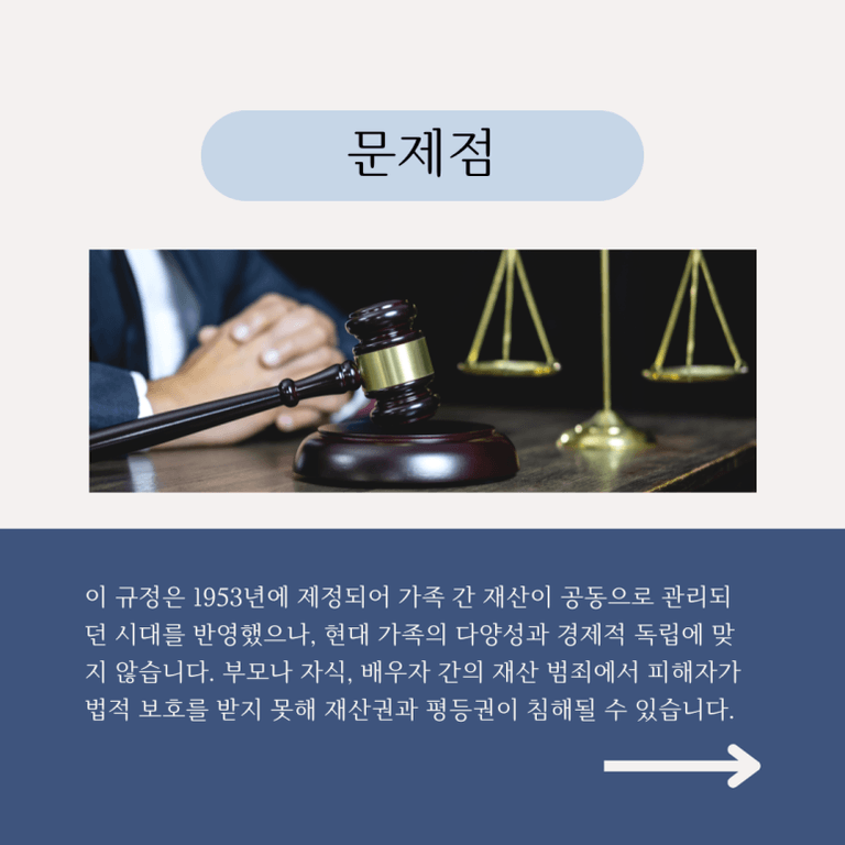 친족상도례 규정은 시대의 변화에 따라 개정이 필요한 법적 제도입니다. 가족 간의 재산 범죄에 대한 처벌이 제대로 이루어지지 않는 것은 피해자의 권리를 침해하고 법적 형평성을 어긋나게 합니다. 앞으로의 법 개정이 사회적 인식 변화와 함께 긍정적인 영향을 미칠 것입니다.
