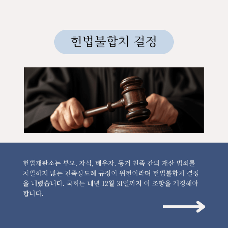 헌법재판소는 최근 친족상도례 규정 중 일부에 대해 헌법불합치 결정을 내렸습니다. 이 결정은 부모, 자식, 배우자, 동거 친족 간의 절도, 사기, 횡령, 배임 등에 대해 처벌하지 않는 조항이 위헌이라는 판단을 내린 것입니다. 헌법불합치 결정은 해당 법조항이 헌법에 위배되며, 이를 개정할 필요가 있다는 의미입니다. 따라서 국회는 법 개정의 시한인 내년 12월 31일까지 이 조항을 수정해야 합니다.