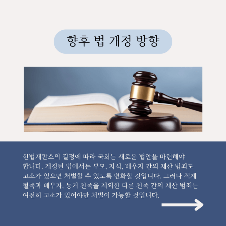 헌법재판소의 결정에 따라, 국회는 새로운 법안을 마련해야 합니다. 전문가들은 법이 다음과 같은 방향으로 개정될 것으로 예측하고 있습니다. 현재 부모, 자식, 배우자 간의 재산 범죄는 고소 없이도 처벌이 불가능하지만, 개정된 법에서 고소가 있으면 처벌할 수 있도록 변화할 것입니다. 이는 피해자가 가족이라는 이유로 불이익을 받지 않도록 하기 위한 조치입니다. 한편, 직계혈족과 배우자, 동거 친족을 제외한 다른 친족간재산 범죄는 여전히 고소가 있어야만 처벌이 가능하다는 조항은 유지될 가능성이 큽니다. 이는 여전히 친족간재산범죄에 국가가 과도하게 개입하는 것을 예방하기 위한 것입니다.