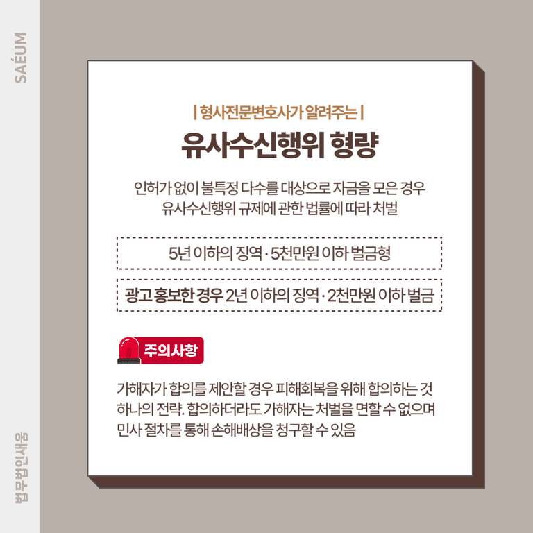 정식으로 인허가를 받지 않은 기관이 불특정 다수를 대상으로 원금 보장과 고수익을 약속하며 자금을 모은 경우, 이는 유사수신행위 규제에 관한 법률에 따라 처벌받습니다. 신속하게 형사전문 변호사의 도움을 받아 고소를 진행하는 것이 중요합니다.