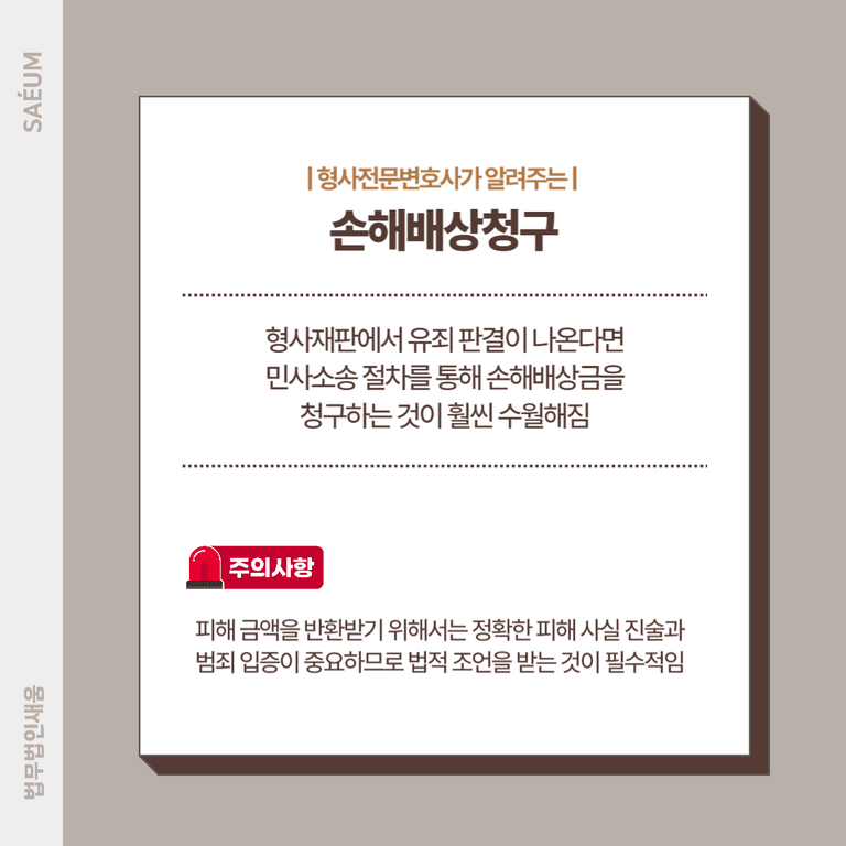 형사재판에서 유죄 판결이 나온다면, 민사 절차를 통해 손해배상금을 청구하는 것이 훨씬 수월해집니다. 피해 금액을 반환받기 위해서는 정확한 피해 사실 진술과 범죄 입증이 중요하므로, 법적 조언을 받는 것이 필수적입니다.