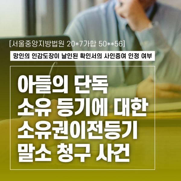 ③ 모친 사망 일주일 전에 아들이 컴퓨터로 작성된 확약서에는 모친의 인감도장이 날인되어 있었기 때문에 위 확약서는 진정성립이 추정되는 처분문서로 보아야 하지만, 당시 모친이 이 문서를 작성하였다는 당시 상황에 의문이 있고, 확약서를 작성한 아들의 컴퓨터가 갑자기 분실되어 정확한 확인서 작성날짜를 알수 없었다는 점 등을 이유로 법원이 진정한 문서인지 의심을 품게 되어 진정성립의 추정이 깨지게 되었습니다. 따라서 피고측의 사인증여항변은 이유없다고 인정되었고, 실체관계에 부합한 등기임도 인정되지 않았습니다.