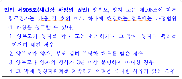 파양은 양부모와 양자 사이의 관계를 원래처럼 아무 사이도 아닌 관계로 만드는 것입니다. 파양은 협의로도 가능하고 재판을 통해서도 가능합니다. 협의상 파양의 경우 민법에서 정한 사유가 없어도 양부모와 양자 사이에 대화를 통해 할 수 있으니 오늘은 재판상 파양을 알아보도록 하겠습니다.