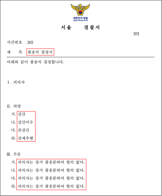 위와 같은 성범죄 전문 변호인의 적극적인 조력의 결과, 경찰 단계에서 의뢰인은 모든 혐의점에 대해 무혐의를 인정받아 불송치결정을 받게 되었습니다. 혐의점이 1-2개가 아닌 다수였기에 만일 유죄가 인정되었다면 실형을 피하기 어려운 사안이었으나, 일찍이 초기 단계에서 적절하게 대응하여 사건을 수월하게 종결하였던 것입니다.