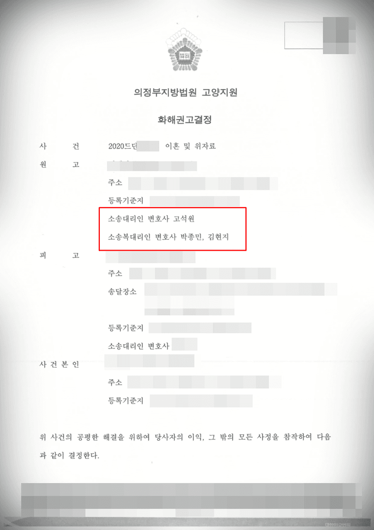 이에 저희 율재는 의뢰인의 아내 및 상간남을 공동으로 하는 위자료·이혼·양육비 청구 소송을 제기하였지만 부모의 이혼 과정에서 자녀가 받는 고통이 크다는 걸 알게 된 의뢰인은 담당 변호사와 상의하여 신속한 사건 마무리를 위하여 법원의 화해 권고를 활용하기로 하였습니다.