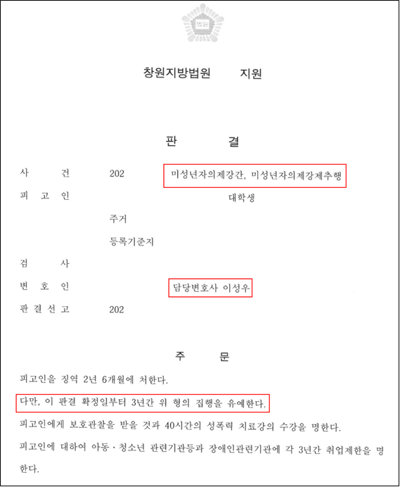 이 사건은 여러 차례의 미성년자의제강간, 미성년자의제강제추행 행위가 있었기에 매우 중하게 처벌될 위험이 있는 사건이었음에도, 변호인의 적극적인 변론 및 합의를 통해 최대한 선처를 구하여 '집행유예' 판결을 받아 실형을 면할 수 있었습니다.