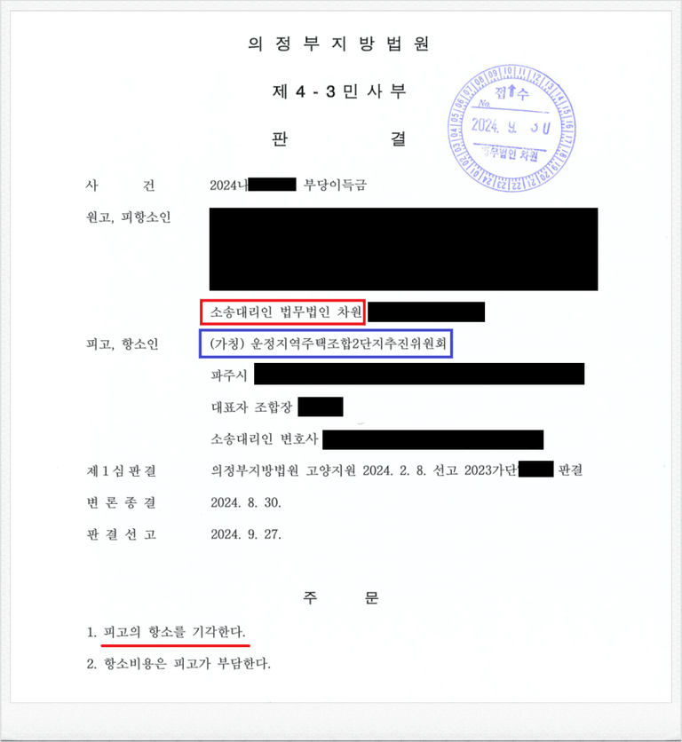 그러나 이와 같은 법원의 판결에도 피고 (가칭)운정지역주택조합2단지 추진위원회 측은 패소를 인정하지 못하고, 항소하였습니다.