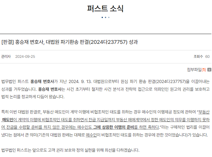법무법인 퍼스트 홍승재 변호사가 지난 2024. 9. 13. 대법원으로부터 원심 파기 환송 판결(2024다237757)을 이끌어내는 성과를 거두었습니다. 홍승재 변호사는 사건 초기부터 철저한 사건 분석과 전략적 접근으로 의뢰인인 원고의 권리를 보호하고 법적 논리를 정교하게 다듬어 왔습니다.