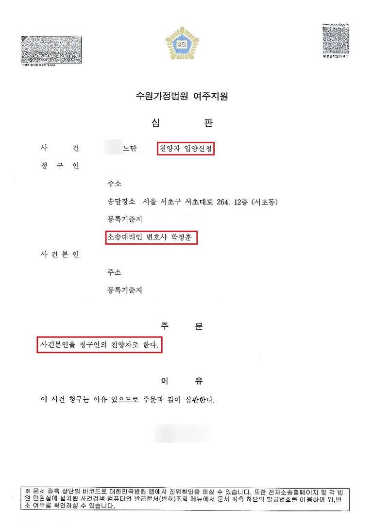 의뢰인이 원하시는 바대로 아이에 대한 친양자 입양 심판을 받아드렸고,