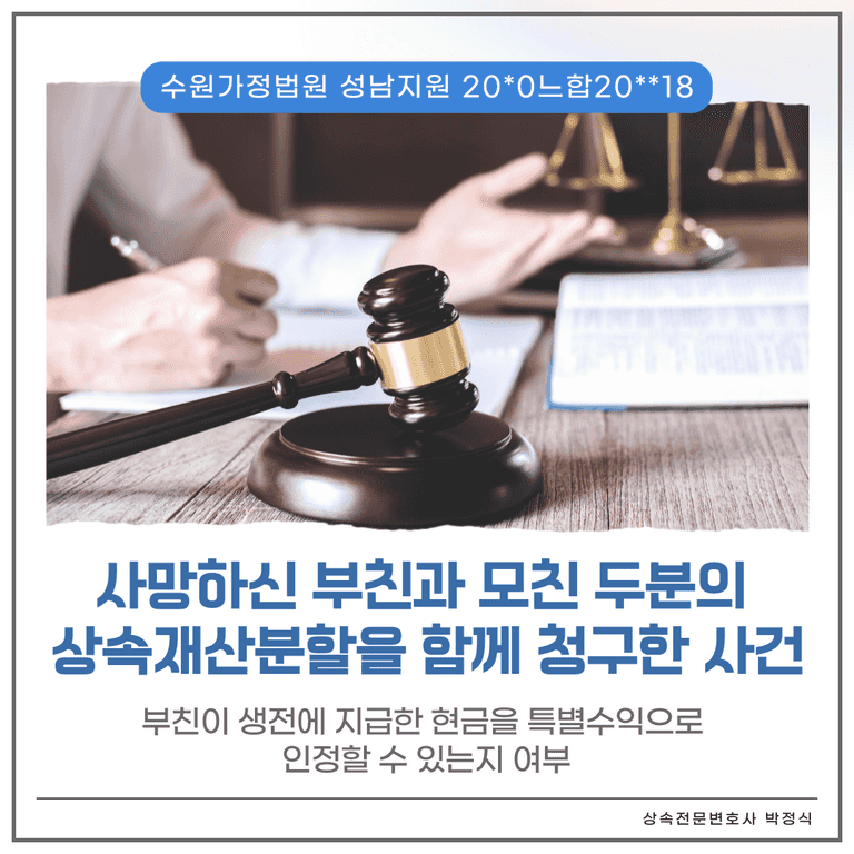 ③ 부친이 생전에 매각한 부동산은 부친과 모친의 부부공동재산으로 볼 수 있는 재산이므로 위 부동산을 매각한 매각대금 중 모친의 계좌로 입금해 준 6억원은 부친이 공동재산을 분배 및 청산의 의미로 준 것으로 보아 이를 모친의 특별수익으로는 인정하지 않은 사례입니다.