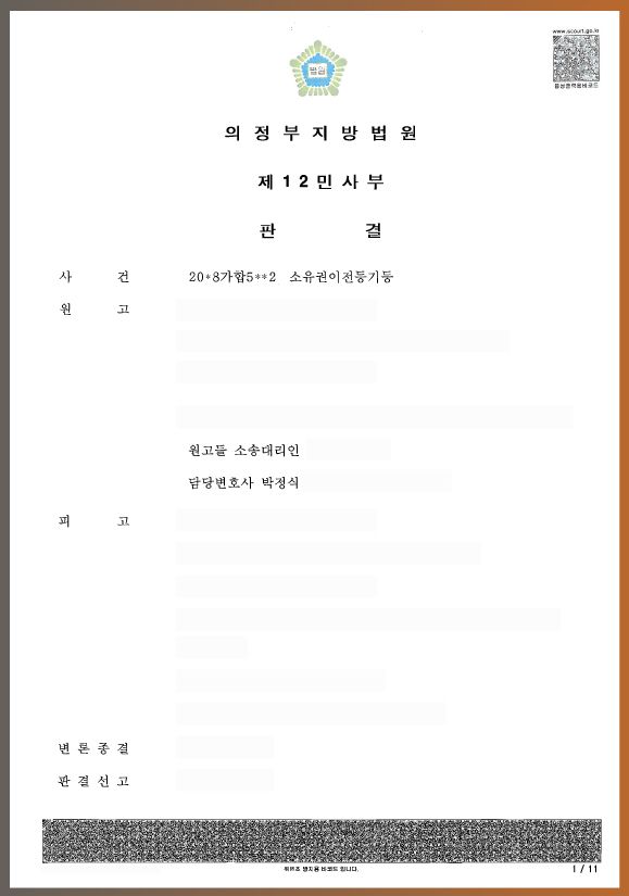 부친께서는 이미 오래전에 사망하셨습니다. 상속인들은 부친 사망 이후 40년이 지나서 당초 부친의 소유였던 부동산이 부친 사망 이후에 매매를 원인으로 삼촌 명의로 소유권이전등기가 된 사실을 뒤늦게 알게 되었습니다. 이러한 사실을 알게된 상속인들은 부친 사망 이후에 매매를 원인으로 이루어진 소유권이전등기는 무효라고 주장하면서 삼촌을 상대로 진정명의회복을 원인으로 하는 소유권이전등기청구와 위 소유권이전등기 이후에 삼촌이 설정한 근저당권설정등기에 대한 말소등기절차를 이행하라는 소송을 제기한 사건입니다.