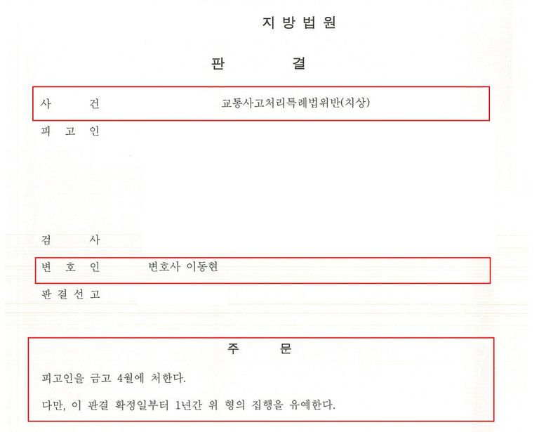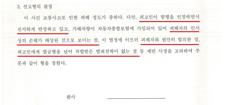 이후 저는 반성문, 탄원서, 교통 관련 교육 이수증, 합의서, 보험사 민사합의 내용 등 여러 양형자료를 바탕으로, A씨는 범행을 모두 인정하고 이 사건에 대해서 진심으로 반성하고 있다는 점, A씨는 B씨와 합의하였고 B씨는 A씨의 처벌을 원하지 않는다는 점, A씨의 보험회사는 B씨와 민사 합의를 하였기에 B씨가 피해받은 것에 대한 배상이 되었다는 점, A씨는 다시는 재범을 저지르지 않기 위해서 스스로 교통 관련 교육을 이수하는 등 최선을 다하고 있다는 점, A씨는 이전에 벌금형을 받은 것 외 징역형, 집행유예 등을 받은 사실이 없다는 점 등을 적극적으로 어필하며 '이번에 한하여 마지막으로 최대한의 선처를 내려달라'는 내용의 변호인의견서, 변론요지서 등을 제출하였습니다.