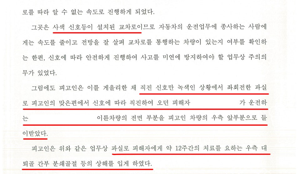 오늘은 제가 직접 진행했던 신호위반으로 이륜차량을 들이받아 진단 약 12주 가량의 상해를 입혀 기소 되었지만 집행유예로 방어했던 사례에 대해 소개해 드리고자 합니다.