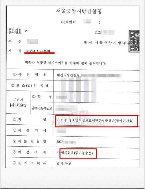 저는 이러한 사정을 참작하여 아동·청소년의성보호에관한법률위반(장애인간음)에 대해서 불기소 처분을 내려주길 바라는 의견서를 검사에게 제출하였습니다.