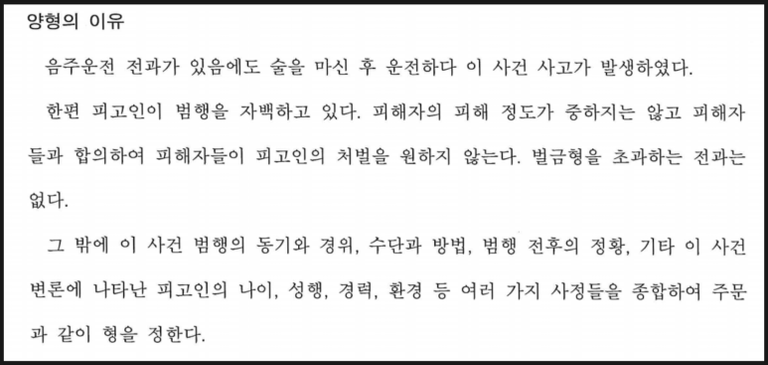 저는 의뢰인이 사고 당시에 20만 원에 합의를 시도하였으나 피해자들은 사고 당시 50만 원을 달라했음에도 불구하고 갑자기 각 400만 원을 요구하여, 의뢰인의 경제사정 때문에 상대방이 원하는 합의금액이 부족하여 합의가 이루어지지 않아 공탁을 할 예정인 점, 사건 이후 병원에서 금주클리닉 프로그램에 참가하여 금주서약서를 작성하였으며 음주운전 재범방지교육을 수료하고 술을 아예 끊겠다고 다짐하고 있는 점, 그리고 후진을 하다가 피해자 차량 앞범퍼를 들이받은 것으로 그 속도 등에 비추어 피해의 정도가 중하지 않은 점을 고려하여 법의 허용 한도 내에서 최대한 관대한 처분을 내려주기를 바라는 내용의 변호인 의견서를 의뢰인의 반성문, 가족의 탄원서 등의 양형자료와 함께 법원에 제출하였습니다.