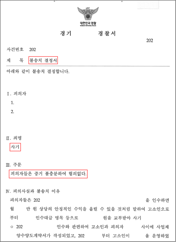 변호인의 설득력 있는 주장 끝에, 결국 경찰 담당수사관은 의뢰인들이 전달한 매출 자료 등에 오류가 있었던 것은 의뢰인들의 의도성 없는 실수였음을 인정하며, 의뢰인들의 사기 혐의에 대해 무혐의 불송치결정을 하게 되었습니다.
