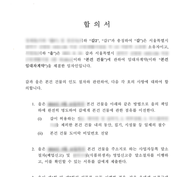 임차인을 설득하여 임대인이 시스템 에어컨을 취득하고, 변호사비 1/2도 보증금에서 공제하며, 임차인이 상가에 설치한 인테리어 등에 대해서 권리금이나 유익비를 요구하지 않는 등 저희 의뢰인에게 굉장히 유리한 내용으로 합의가 잘 마무리될 수 있어 뿌듯했습니다.