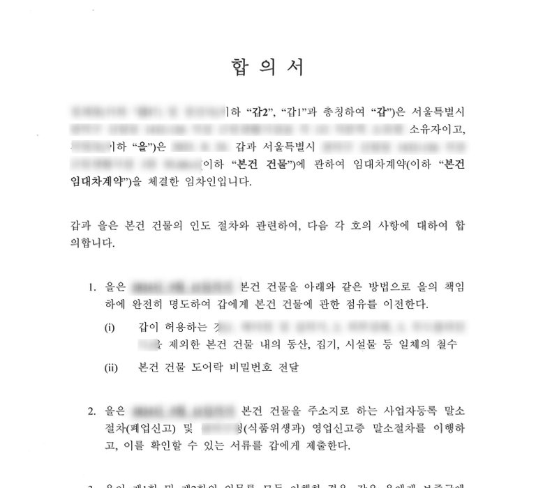 1) 임차인이 건물을 ~날까지 인도할 것, 시스템 에어컨은 그대로 둘 것, 사업자 등록 및 영업신고증을 말소할 것,