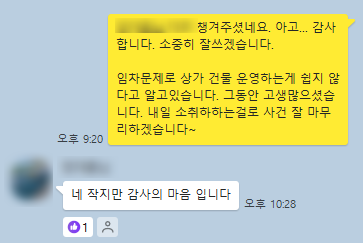 임대인의 말대로 임차인께서는 말투가 굉장히 거치신 편이었는데, 임대인을 대신하여 차분하게 임차인에게 상황을 설득하고 서로가 최대한 이익이 되는 방향으로 잘 해결하자고 설명드렸습니다.