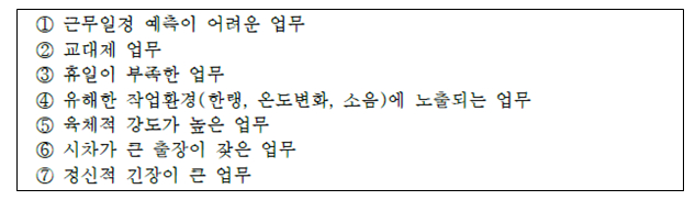고용노동부 고시는 업무부담 가중요인에 대해 아래와 같이 규정하고 있습니다.