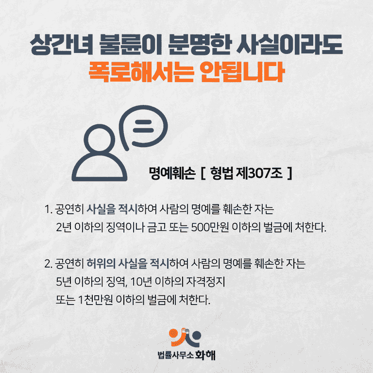 외도했던 과정 없이 사실만 전달했다 해도, 상간녀 명예훼손으로 고소당할 수 있기 때문이에요.