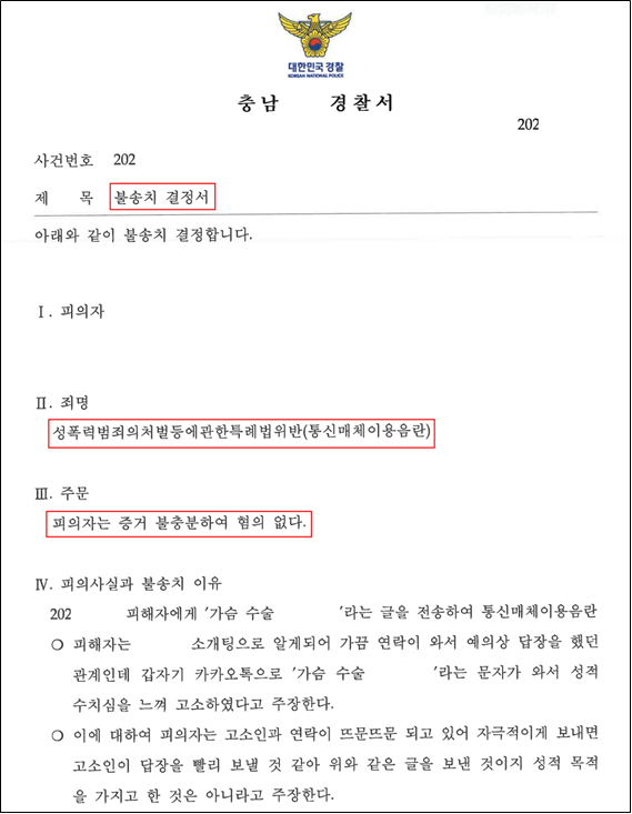 다행히도 경찰은 변호인이 주장한 사정을 고려하여 의뢰인에게 '성적 욕망을 유발하거나 만족시킬 목적'이 없었다고 판단하면서 이 사건은 통신매체이용음란죄가 인정되지 않는다고 보아 무혐의 불송치결정을 하게 되었습니다.