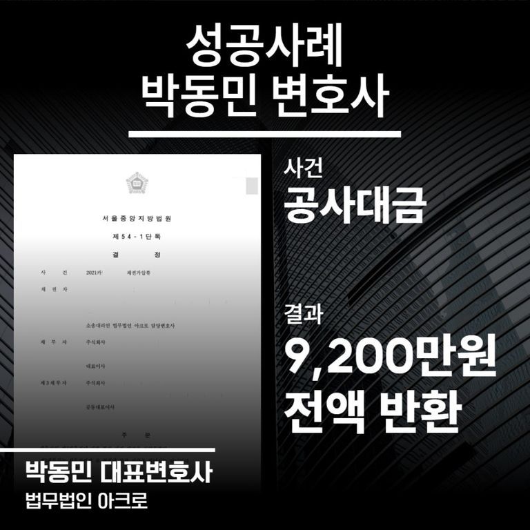 그러므로 공사대금소송을 고려하고 계신다면, 성공사례와 실력이 좋은 “건설 전문 박동민 변호사”에게 상담을 요청하셔서 법적인 조력을 받고, 여러분에게 맞는 전략을 통해 모든 대금을 반환받으시길 바랍니다.