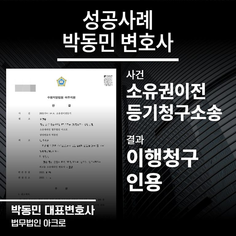 따라서, 지금부터 “소유권이전등기소송, 법원에서 이행 결정받은 사례”를 소개해 드릴 테니, 도움이 필요하시다면 “법무법인 아크로, 부동산 전문 박동민 변호사”에게 상담을 요청하셔서 법적인 조력을 받으시길 바랍니다.