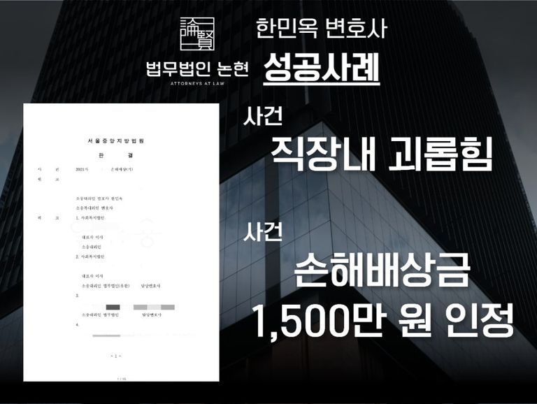 따라서, 지금부터 “직장내 괴롭힘 신고, 1,500만 원 배상받은 사례”를 소개해 드릴 테니, 이 글을 읽어보시고, 도움이 필요하시다면, “민사 전문 한민옥 변호사”에게 상담을 요청하셔서 법적인 조력을 받으시길 바랍니다.