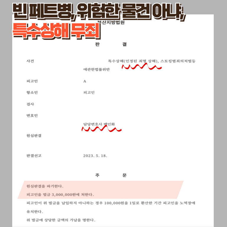 재판부는 "검사가 제출한 증거들만으로는 피고인이 생수가 가득 찬 페트병으로 피해자의 눈 부위를 내리쳤다는 점을 인정하기에 부족하다”며 “물이 가득 차 있지 않은 빈 페트병 자체는 피해자나 제3자가 생명 또는 신체에 위험을 느낄 수 있는 물건이라고 보기 어렵다고 판단.