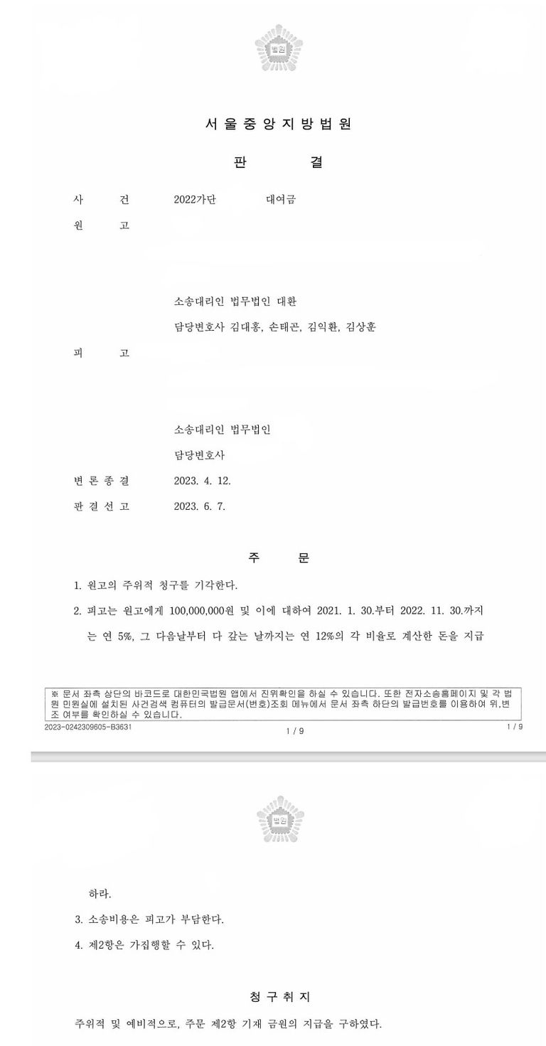 의뢰인은 사업 목적으로 자금이 필요한 상대방에게 1억 원을 빌려주고 그 증빙자료로 투자계약서(2억)를 작성하였습니다. 그러나 상대방은 위 1억 원이 투자금이라는 이유로 반환을 거부하였고, 의뢰인은 이를 회수하고자 당 법무법인에 사건을 의뢰하였습니다. 당 법인은 주위적으로 대여금 1억 원의 반환을 청구하면서도, 예비적으로 투자금이라고 하여도 출자 직후에 동업관계가 결렬되었다는 점을 근거로 전부승소 판결을 이끌어냈습니다.