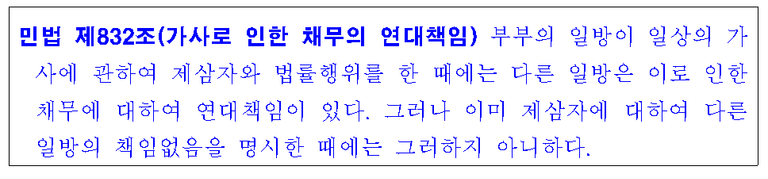 이 때, 다른 배우자의 동의없이 빚을 졌어도 연대책임을 지게 됩니다.
