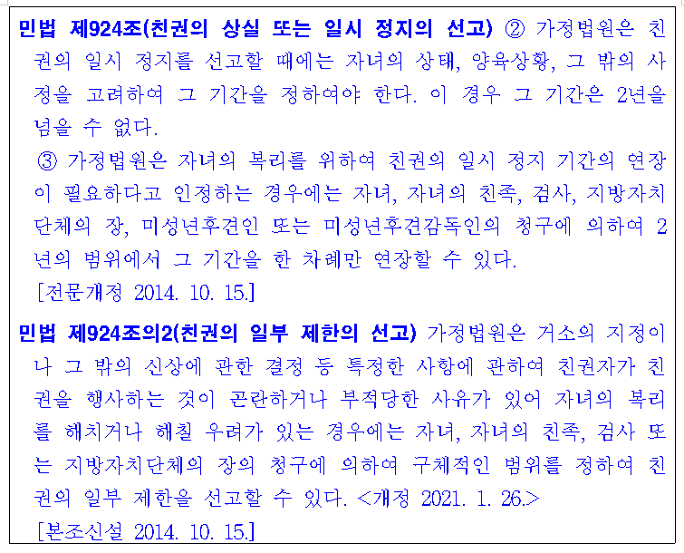 그래서 법원은 친권 제한, 일시 정지 등을 고려해보고 그럼에도 친권 상실이 필요하다고 판단될 경우 이를 선고합니다.