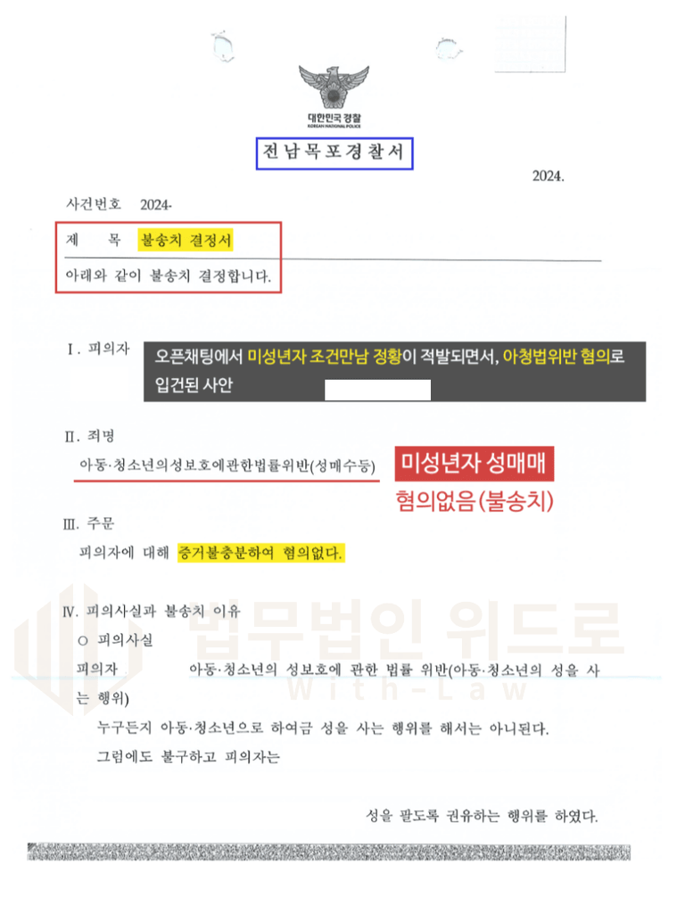 이렇게 사건 초기부터 위드로의 조력을 받은 결과, 수사기관은 무혐의 불송치처분을 내리며 경찰단계에서 사건을 종결지을 수 있게 되었습니다.