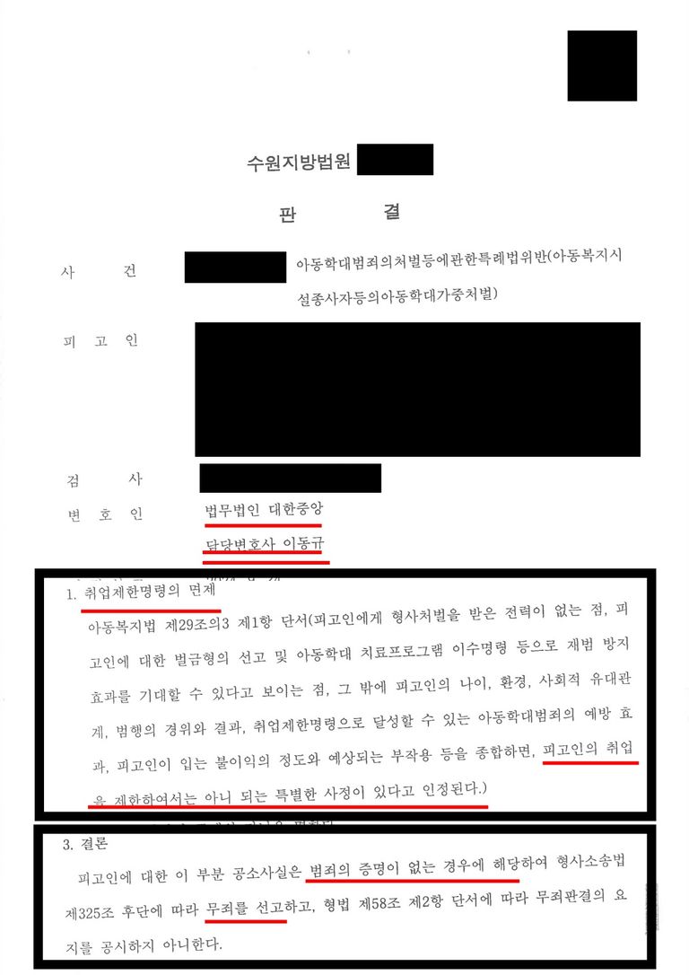 그 결과 이동규 변호사의 주장이 인정되어 재판부는 일부 무죄를 선고했으며, 일부 무죄라 하더라도 초범이며 충분히 반성하고 있는 점, 나이나 환경, 범행의 경위나 결과를 근거로 들어 취업제한명령의 면제를 받아낼 수 있었습니다.