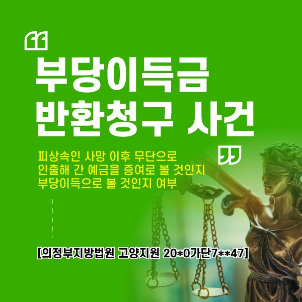 부친은 피고를 만나 재혼을 하여 생활하다가 재혼 후 3년 만에 사망하였습니다. 부친사망후 유일한 자녀인 원고가 부친의 상속재산에 대해서 확인하는 과정에서 재혼배우자인 피고가 부친 사망 이후에 부친의 예금계좌에서 상당한 액수의 예금을 인출하여 가져간 사실을 확인하고, 이에 대해서 인출해 간 예금에 대해서 원고의 상속분에 해당하는 금액을 반환해 달라고 요구하였지만 피고는 위 인출금의 반환의 거부하여 원고가 피고를 상대로 부친 사망이후에 인출해간 예금에 대하여 부당이득금반환청구를 한 사안입니다.