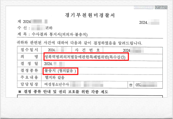 수사기관은 제가 작성한 변호인 의견서의 내용을 수렴하여 「성폭력범죄의처벌등에관한특례법」위반(특수강간)에 대해 혐의없음으로 불송치 결정을 내렸습니다.