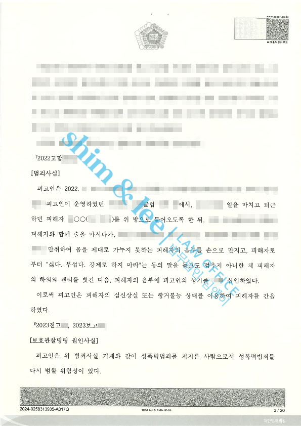 ③피해자 범행 당시에 심신상실 및 항거불능 상태로 가해자가 동의를 받지 않고 성관계를 한 점을 강조하여 재판부에 두 차례나 의견서를 제출하였고 가해자가 무죄를 주장하는 부분들을 세세히 반박하였습니다.