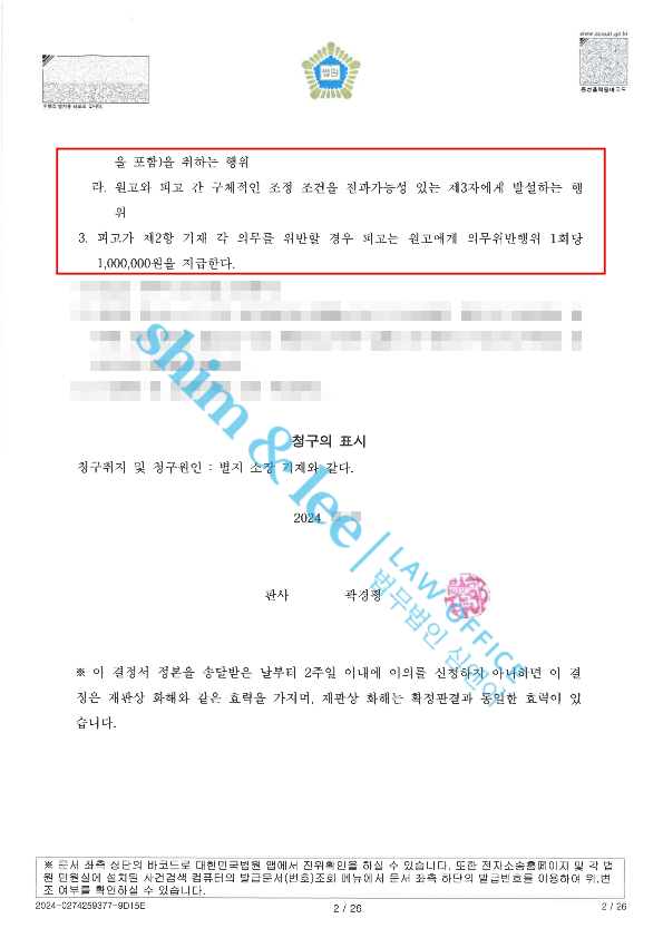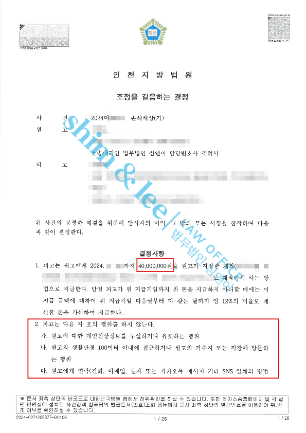 위자료 4,000만 원이라는 강제조정결정과 함께 피해자에 대한 비밀유지의무, 접근금지 및 통신제한의무 부가조건까지 붙게 되었습니다.