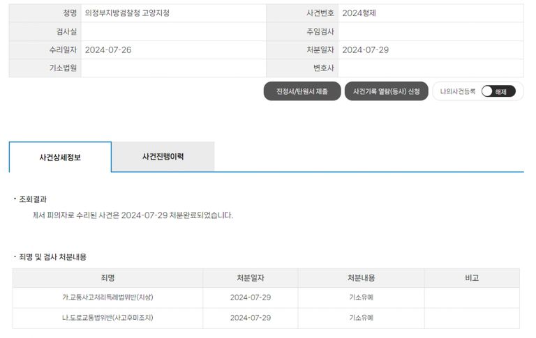 그 결과, 담당수사관은 오승일 변호사의 주장을 받아들여 특정범죄가중처벌등에관한법률위반(도주치상)이 아닌 교통사고처리특례법위반(치상) 및 도로교통법위반(사고후미조치)으로 검찰송치하였고, 담당검사는 오승일 변호사가 제출한 변호인의견서 및 여러 양형자료를 바탕으로 위 혐의에 대하여 모두 기소유예 처분을 하였습니다.